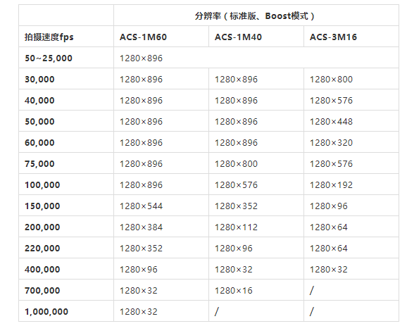 ? ? ? ?2018年日本nac Image Technology公司針對1280×896(1.14M Pixel)像素級的高速攝像機推出了ACS系列,2020年又將ACS系列進行整體升級,推出了市場上首款拍攝速度達到10萬fps(百萬像素下)的Memrecam ACS-1 M60。ACS-1 M60采用適配性超高的1280×896 CMOS傳感器,滿幅拍攝速率可達到60,000幀/秒(彩色芯片)100,000幀/秒(黑白芯片);超高的拍攝速率可達到1,000,000幀/秒(標準版);具有超高感光度(ISO-Daylight SAT):100,000(黑白)/20,000(彩色)。納秒級的時間精度,使其具有更高的幀速率、幀同步及曝光精度;500ns的跨幀模式曝光時間間隔,使其可完全滿足PIV/PTV/LIF/DIC等非接觸式測量應用的需要,無圖像滯后;另有超大內(nèi)部存儲器1TB可選配;可連接模擬和數(shù)字監(jiān)視器實時顯示拍攝圖像,通過觸屏或JPAD控制器進行控制攝像機,無需將其與PC連接,可適用于各種需要考慮環(huán)境條件的應用;與PC連接時,還可通過專用的USB3.0線纜進行數(shù)據(jù)的高速下載存儲,速度遠高于傳統(tǒng)的千兆網(wǎng)線。